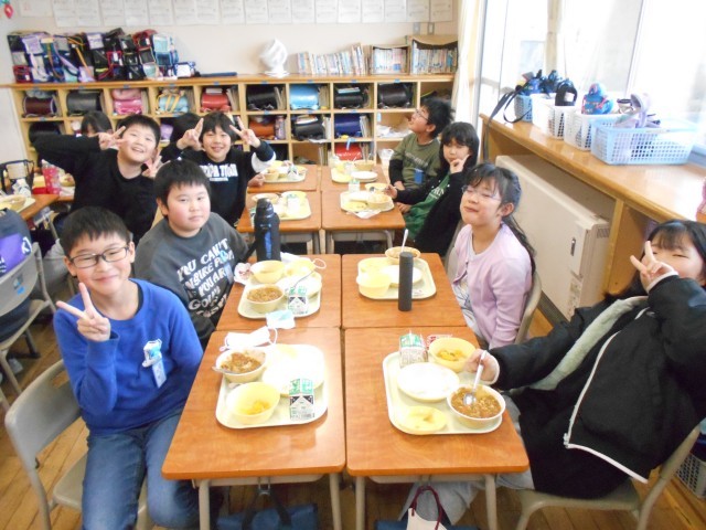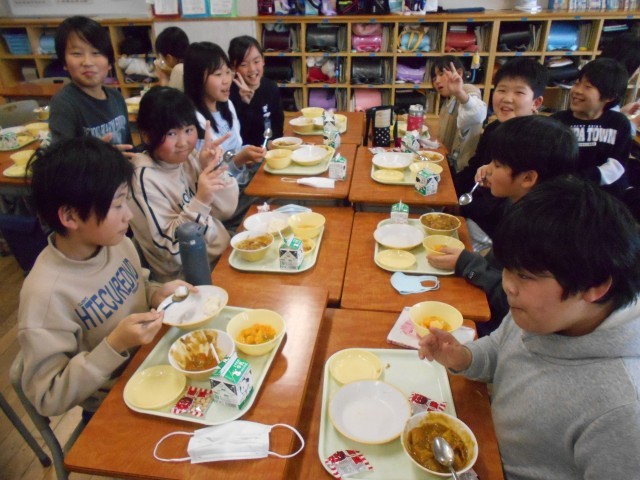 今日の給食は、人気メニューの「カレーライス」でした。みんなニコニコです!