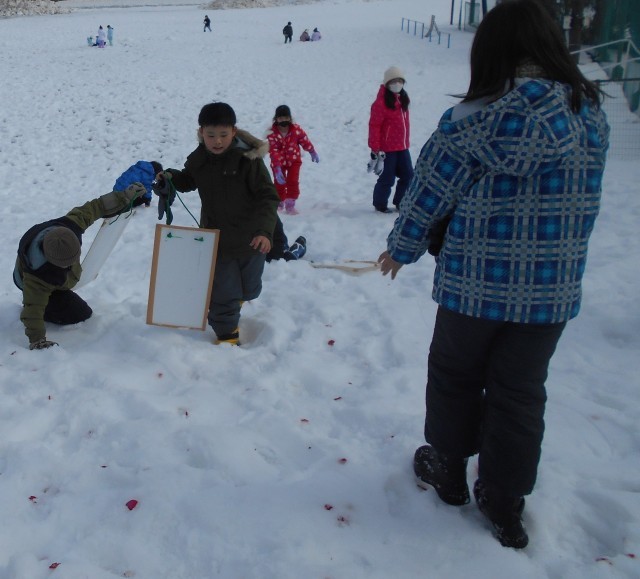 体育の時間に雪遊びを行いました。雪だるまを作ったりそりで滑ったりするなど、楽しそうに活動していました。