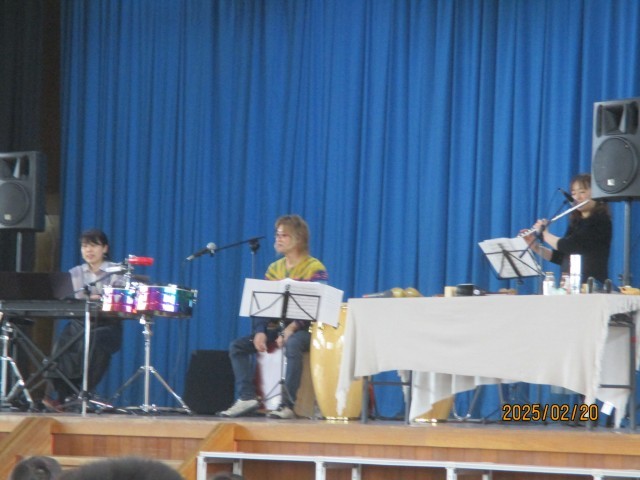 パーカッション、フルート、キーボードの奏者の方に、コンサートをして頂きました。色々な楽器を紹介してもらったり、演奏させてもらったりしました。最後はアンコール曲「ジャンボリミッキー」に合わせて楽しく踊りました。