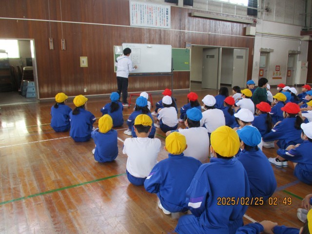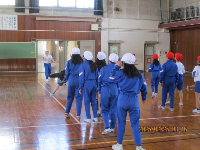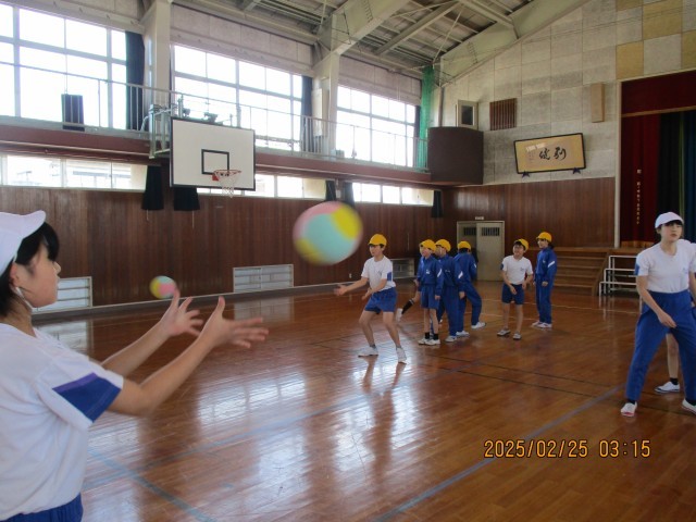 体育科「ポートボール」の授業が始まりました。今日は、ポートボールのルールや、相手につなぐパスの仕方を確認して、各団で何回パスをつなぐことができるか競い合いました。