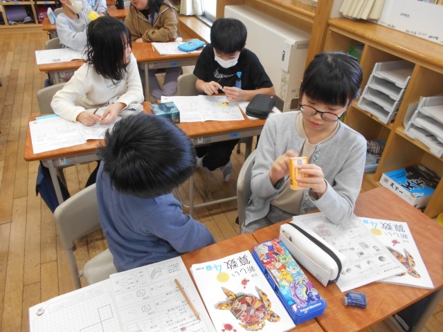 今日は、実際に箱を見ながら直方体と立方体の特徴を整理しました。「直方体には形も大きさも同じ面が2つずつ3組あるね」「立方体は6つだ」などと、いろいろな気付きを口にする子供たちでした。
