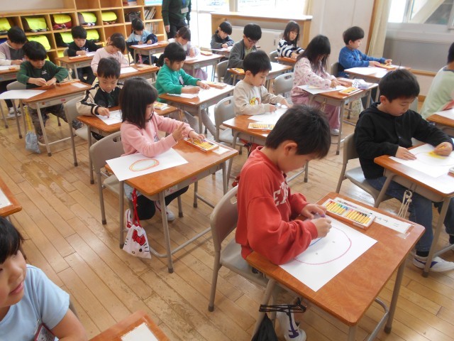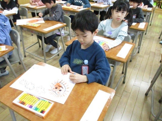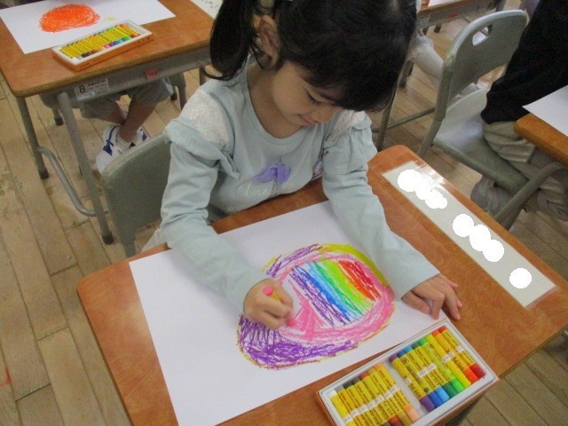 わたしだけのおひさま、にこにこえがおのおひさまをクレヨンで描きました。子供それぞれの思いで、色や形を工夫したり、好きな物を描いたりしています。保護者の皆様、学習参観にお越しの際はぜひご覧ください。