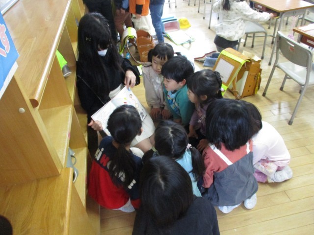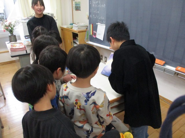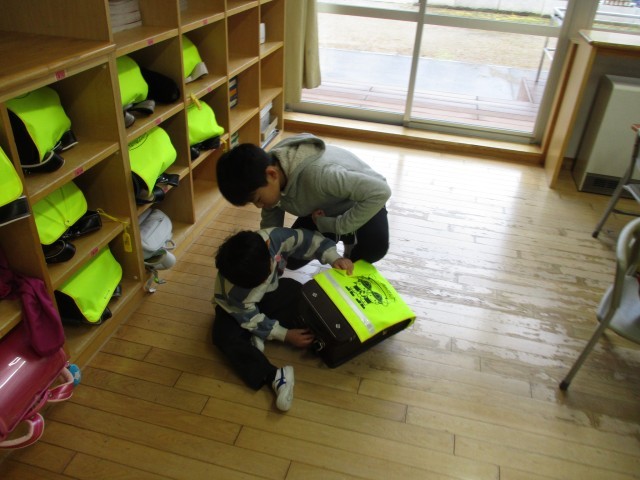 各教室に分かれてランドセルの準備を手伝ったり、一緒に雨具をたたんだり、絵本の読み聞かせを行ったりしています。