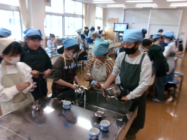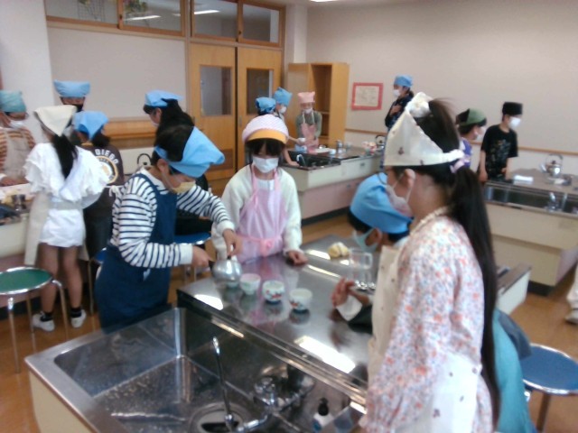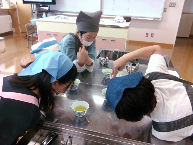 初めての調理実習は、急須を使ってお茶を淹れました。普段家ではお茶を淹れる機会の少ない子供も多く、「苦いけれどおいしい!」「家でも淹れてみたい」という声が聞かれました。準備から片付けまで班で協力して行いました。ほっと一息つくよい時間でした。