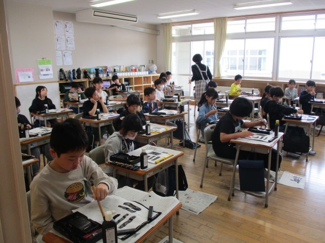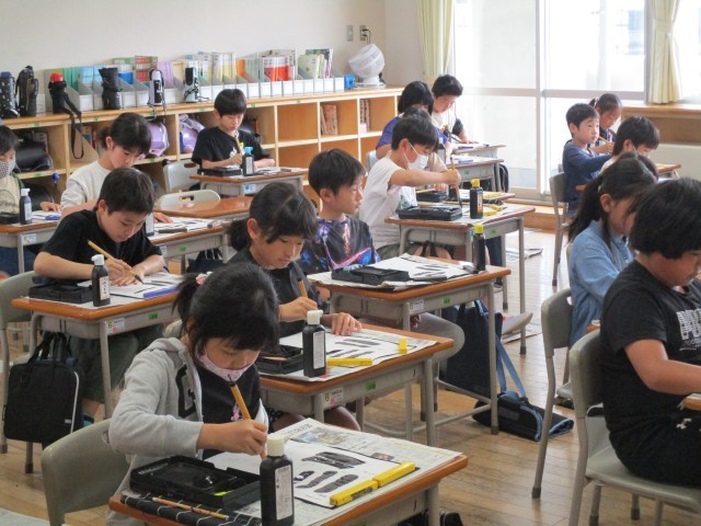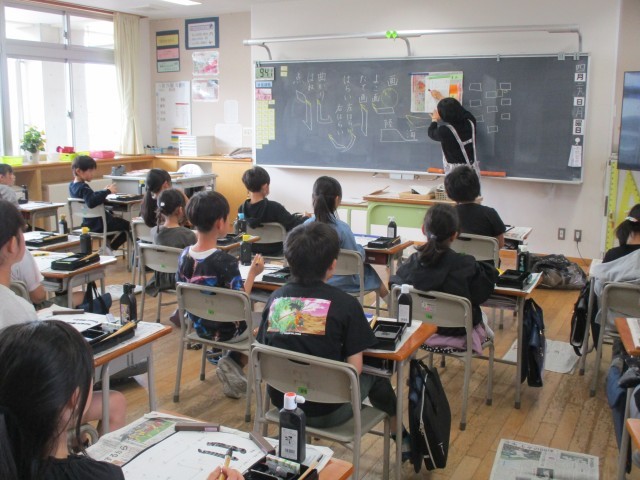 書写が始まりました。子供たちは、心を落ち着かせ、「すうー、とん」などと先生の指示に合わせて線の引き方や折れの書き方を練習していました。「動」と「静」の時間のメリハリをつけてがんばってほしいです。