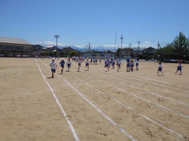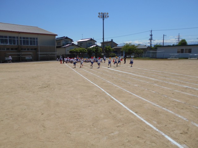 運動会で行う50m走の並びを確認したり、走ったりしました。周りの人に負けないように頑張っています。