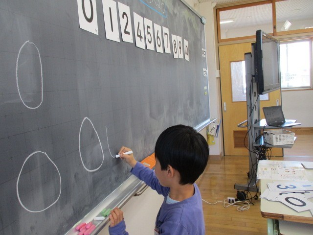 算数の時間に「なかまづくりとかず」について学習しています。数カードを使って、数の大きさを比べたり、0という数について学習したりしました。声に出しながら、数についての学びを深めています。