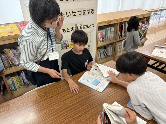 国語の「図書室の達人になろう」の学習では、実際に図書室を訪れ、司書の先生に教えていただきながら、自分の読みたい本をさまざまな方法で探しました。子供たちは初めて手にする百科事典に興味津々で、ページをめくりながら新しい知識との出会いを楽しんでいました。