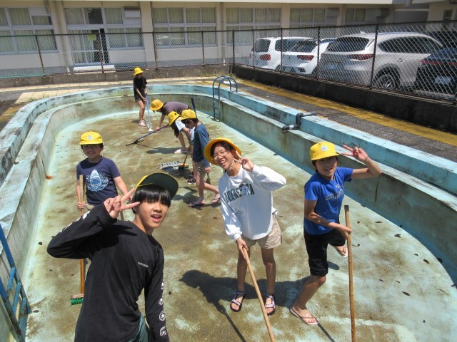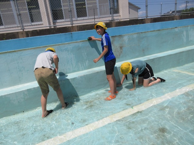6年生によるプール清掃のおかげで、プールの底の色がようやく見えてきました。側面や側溝などはまだまだ汚れていたので、引き続きブラシでゴシゴシとこすり続けました。だんだんときれいになっていくプールに子どもたちのがんばりを感じました。