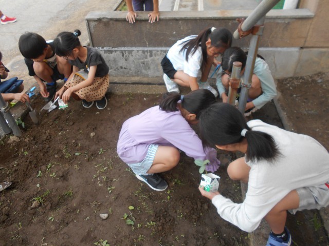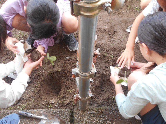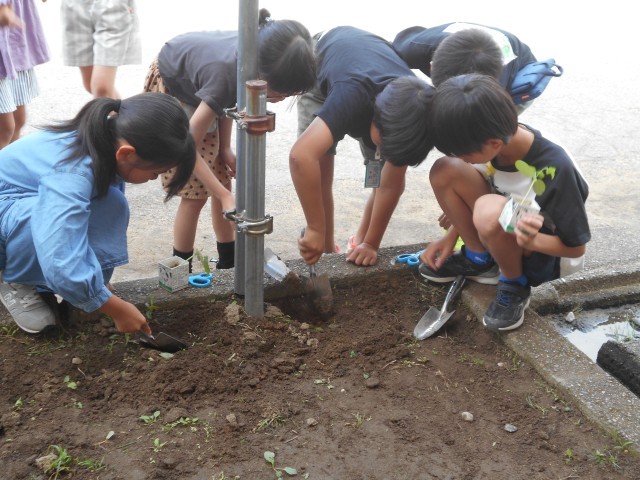 教室で育てていたヘチマの葉が大きく育ってきたため、外に植え替えを行いました。「2本の指でやさしく挟むんだよ」「土はしっかりかぶせようね」と、これまでに学んだことを子供たち同士で声をかけ合いながら、丁寧に植え替えをしている姿が見られました。