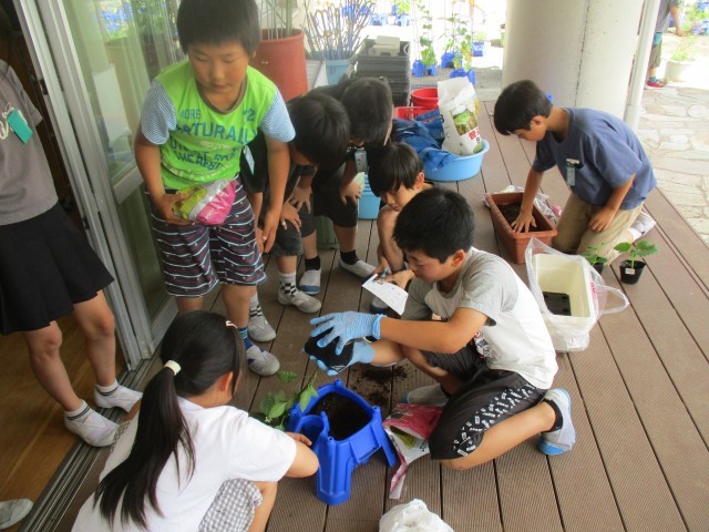総合的な学習の時間に取り組んでいるエコライフプロジェクトで、二酸化炭素を減らすために自分たちにできることについて話し合いました。植物を増やすことで二酸化炭素を減らすことができると知り、早速家から様々な植物を持ち寄って植えました。子供たちは「早く芽が出ないかな」「どんな花が咲くかな」と植物の成長を楽しみにしていました。