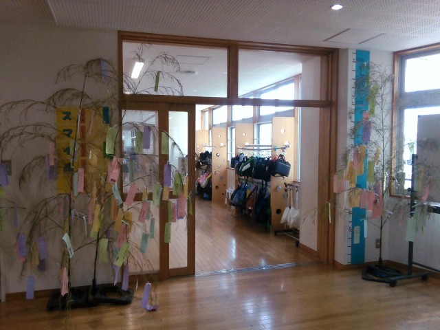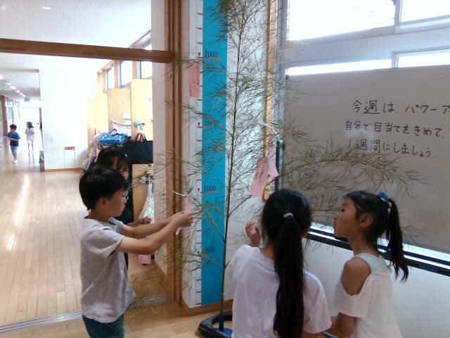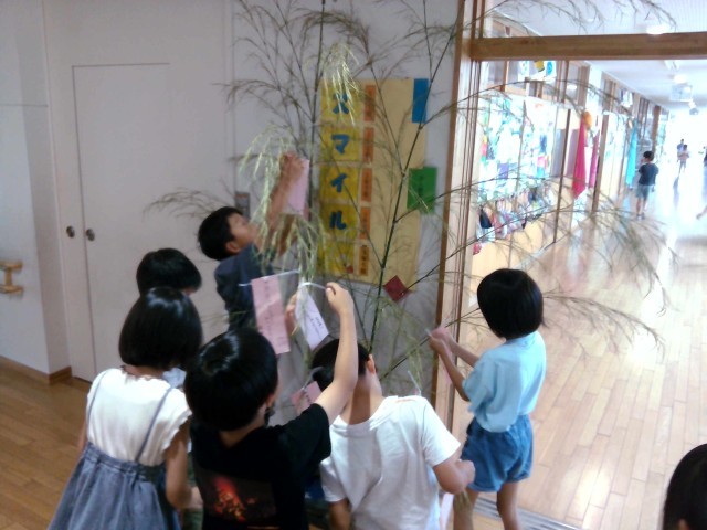 七夕に向けて、短冊に願いを書きました。「家族全員が健康でいられますように」や「3年生全員がスマイルでいられますように」など、心温まる願い事がたくさん飾られていました。