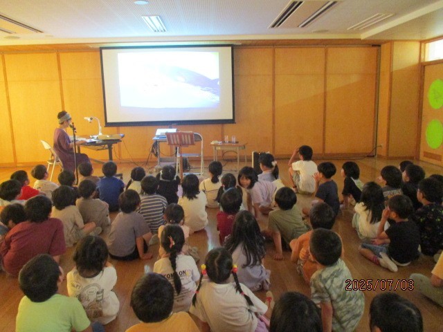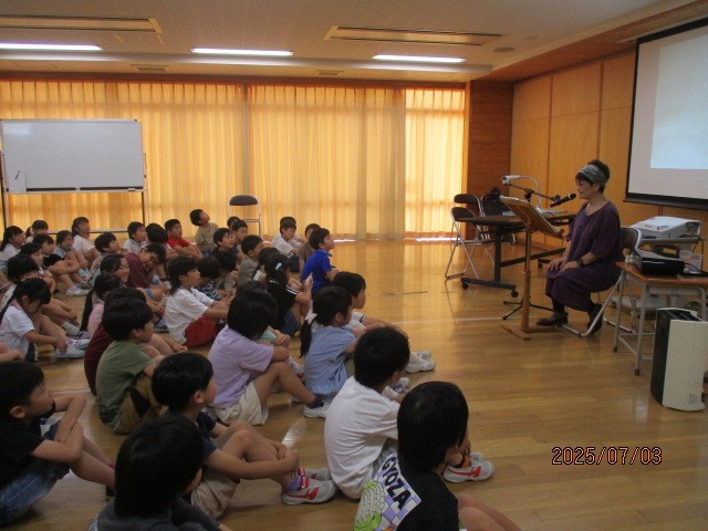 1年生にとって初めての朗読会が行われました。声や音楽で臨場感たっぷりのお話に、いつの間にか引き込まれていきました。また、大きく映し出しされた挿絵を見ながらつぶやいたり、みんなで声を出して読んだりするなど、お話にじっくりと浸れる時間となりました。