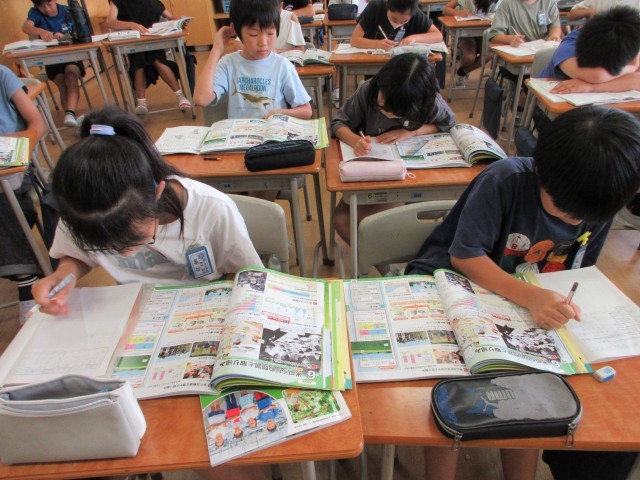 社会の学習では、米作りについて学習しています。この日は「米作りの課題」について調べました。米作り関係の仕事に就く人が減っていることや物の値段が高騰していること等、多くの問題を抱えながら農業を行っている実態を知りました。