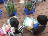 あさがおの観察をしました。葉っぱの数や大きさの変化、つるが伸びている様子をじっ...