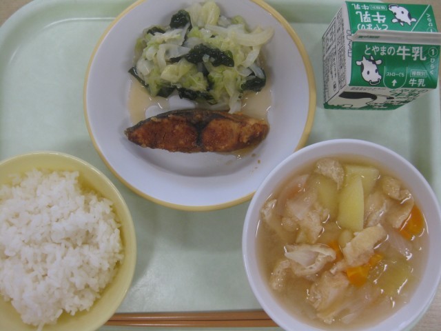 今日の献立は、ごはん 牛乳 ふくらぎのかば焼き 酢の物 みそ汁 です。