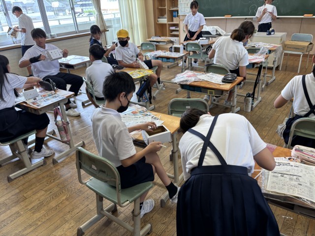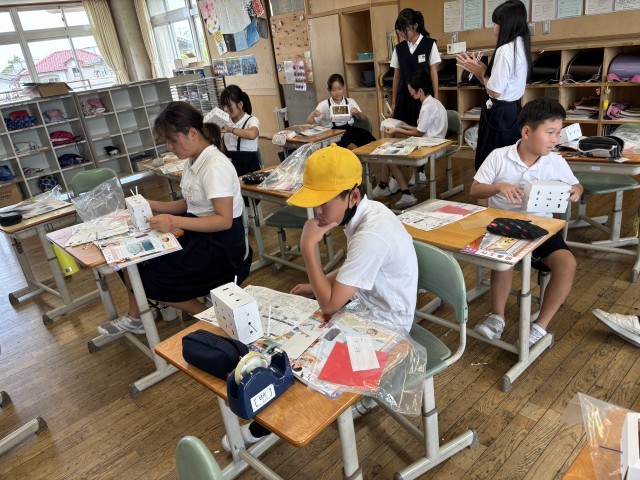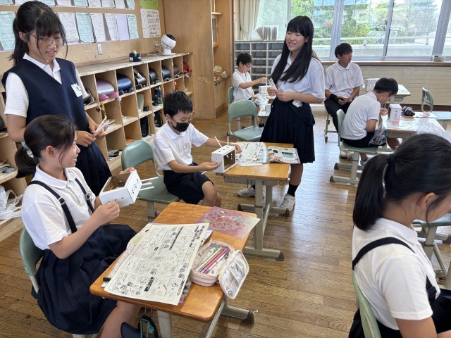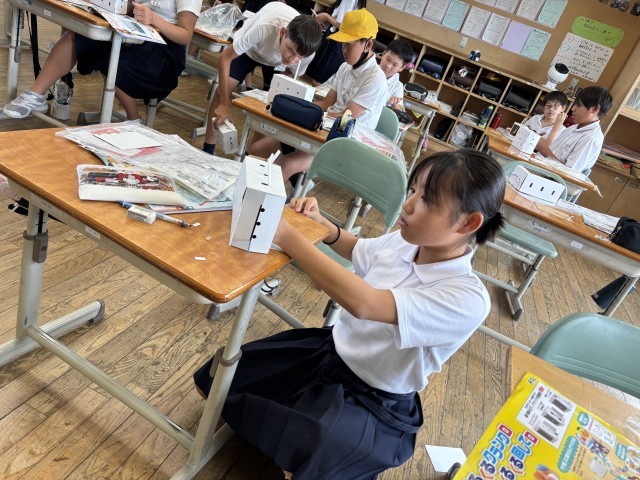 図画工作科の学習では「くるくるクランク」という作品づくりに取り組んでいます。今日は、「クランク」にストローを付けて回転させると、ストローがどのように動くかを確かめました。子供たちは、ストローの動きからどのような作品にしたいかイメージを膨らませています。完成が楽しみです。