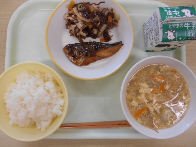 今日の献立は、ごはん 牛乳 ふくらぎの照り焼き もずくのチャプチェ 中華かき玉汁 です。