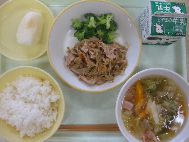 今日の献立は、ごはん 牛乳 豚キムチ丼 ゆでブロッコリー はくさいスープ 梨 です。