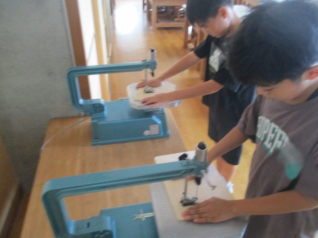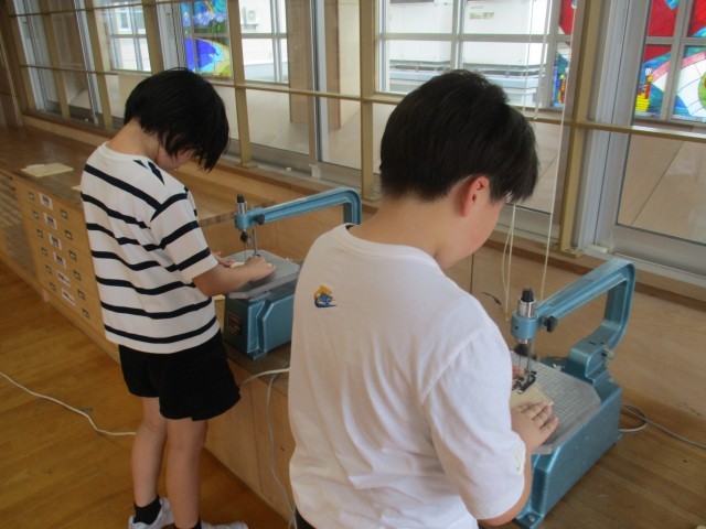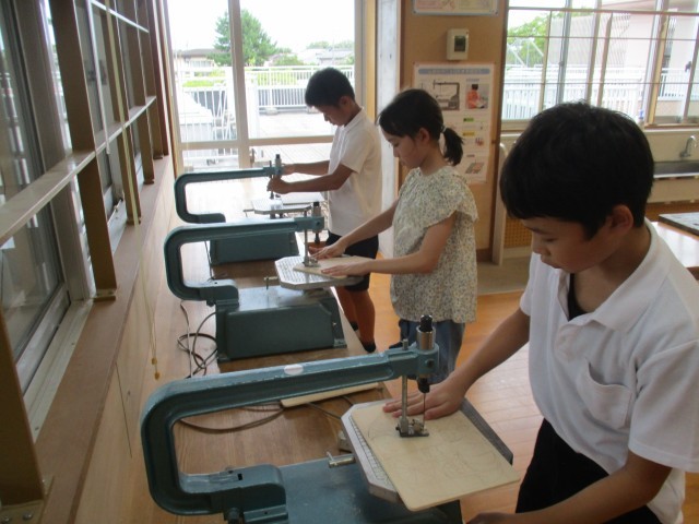 図画工作科「糸のこスイスイ」の学習では、安全に気を付けて板を電動糸のこぎりで切り、パズルを作っています。