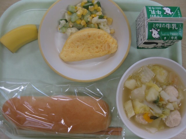 今日の献立は、コッペパン 牛乳 チーズオムレツ カラフルサラダ 野菜のスープ煮 バナナ です。