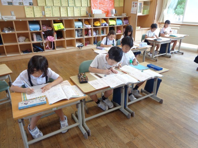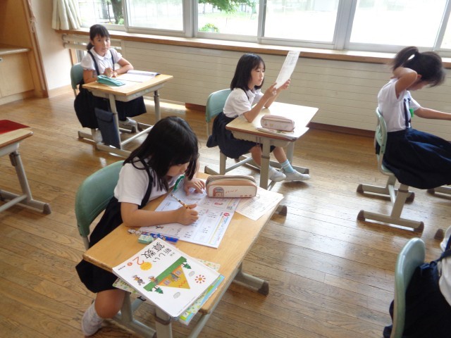 一人で取り組みたい子、ペアやグループで取り組みたい子等、自分で学習形態を選んで問題に取り組んでいます。わからないところがあれば、進んで質問したり教えたりしています。