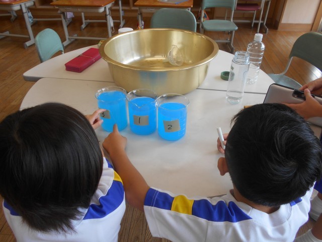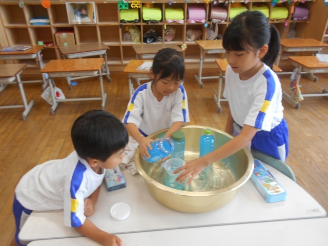 入れ物に水を入れると、どちらが多く入るか考えました。調べるときは、友達と協力して準備を行い、水の多さを確かめました。いろいろな比べ方があるとわかったようです。