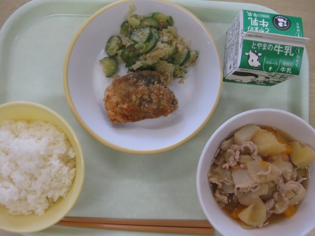 今日の献立は、ごはん 牛乳 さばの竜田揚げ ごま和え 豚肉の炒め煮 です。