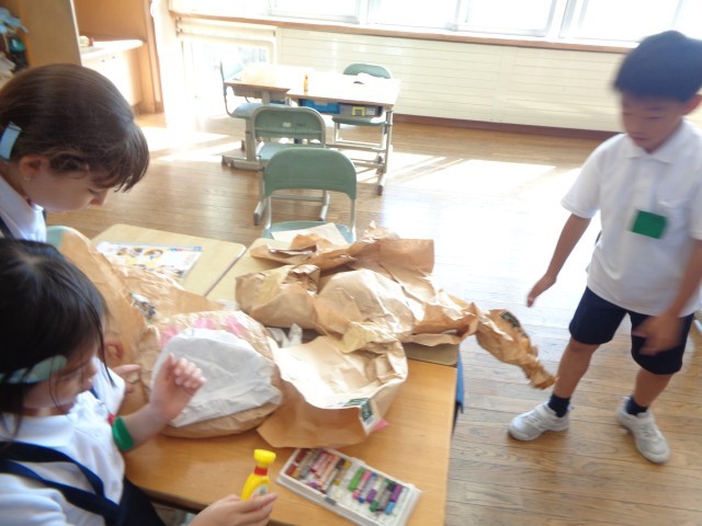 紙をくしゃくしゃにする感触や、紙に新聞を包んでふわふわになった感触を楽しみながらイメージを広げました。猫や人形、ハンバーガー等、思い思いに製作していました。