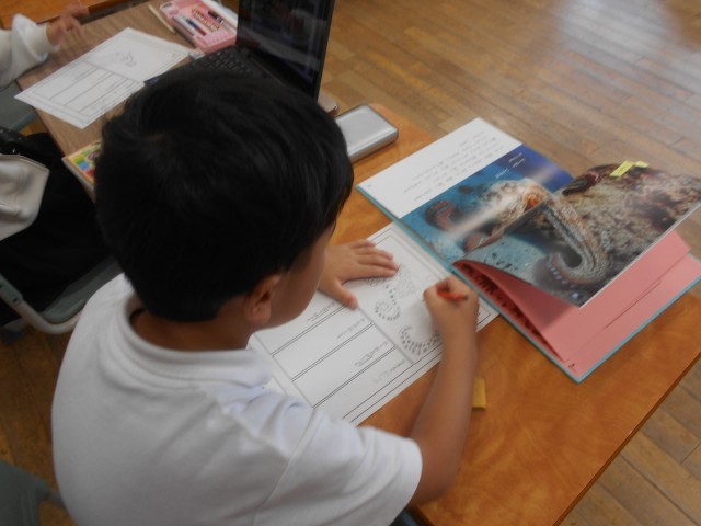 国語科では、うみのかくれんぼの学習をしています。今日は海の生き物図鑑を作るために、本を見ながら、生き物の隠れ方や体の特徴を調べました。