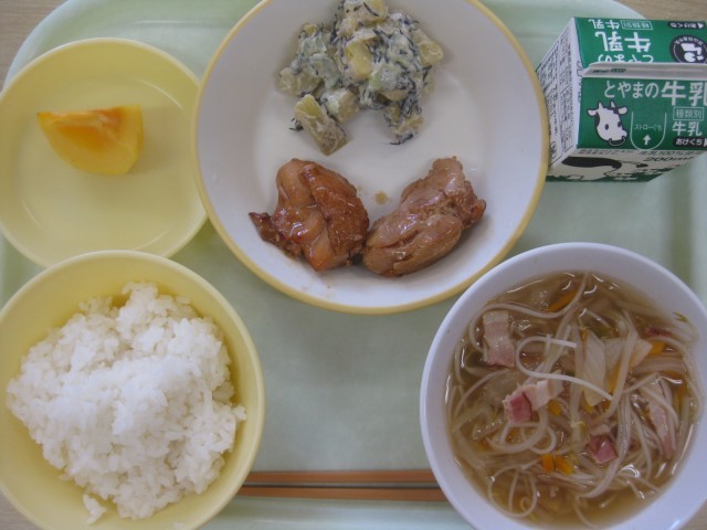 今日の献立は、ごはん 牛乳 照り焼きチキン さつまいもとひじきのサラダ ビーフンスープ 柿 です。
