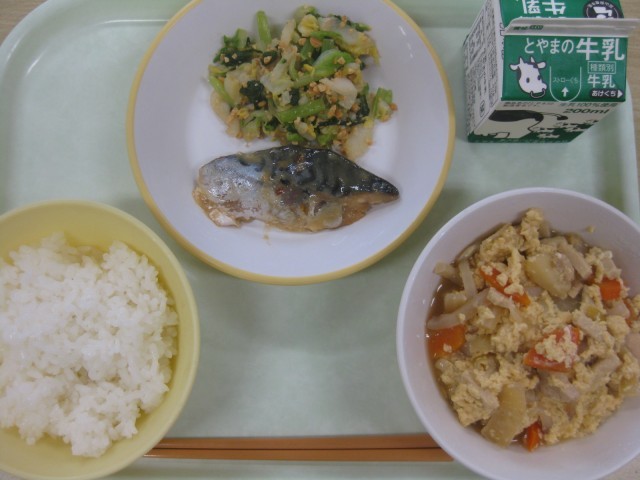 今日の献立は、ごはん 牛乳 さばのみそ煮 いり大豆和え 卵とじ です。