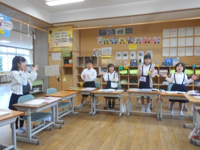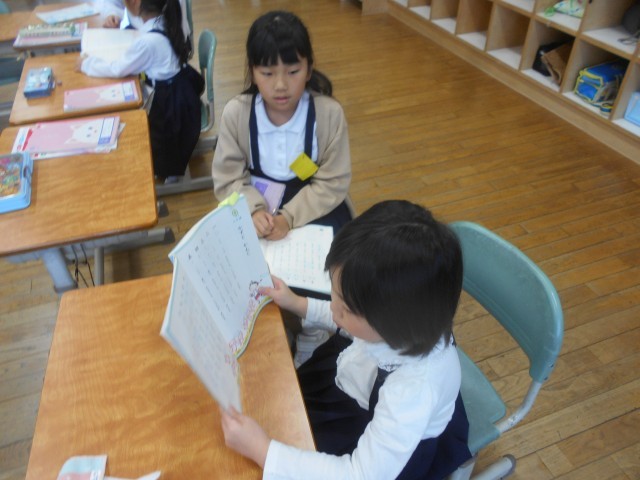 「かずとかんじ」の歌を音読しました。「楽しく読むにはどうしたらいいかな」ときくと、「手をたたきながら読む」「友達と一緒に声を出す」など、いろいろな提案がありました。全員で楽しく音読して、数の漢字の読み方に慣れ親しみました。