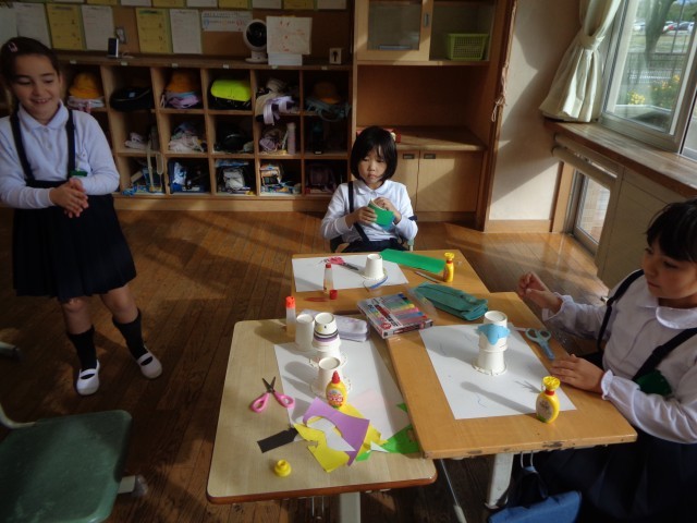 紙コップが飛び出す様子からイメージを広げ、鳥や虫などに見立てて製作を楽しんでいます。