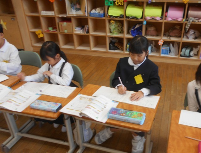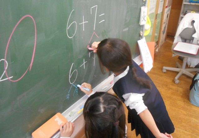 くりあがりのある足し算を学習しています。子供たちは計算しやすくなる方法を考え、問題を解いています。