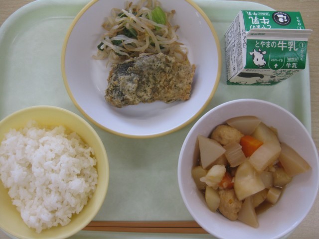 今日の献立は、ごはん 牛乳 あじのえごま揚げ チンゲンサイひたし おでん です。