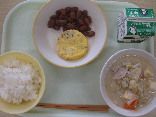 今日の献立は、ごはん 牛乳 かにたま 煮豆 ごま豆乳鍋 です。