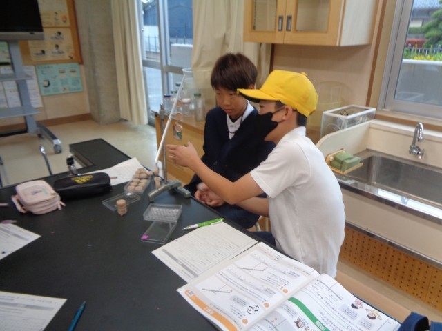理科では、てこの学習をしています。おもりをどこにかけると、てこが水平につり合うのか、グループで話し合いながら学習しました。