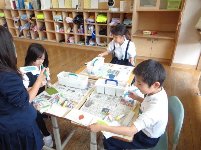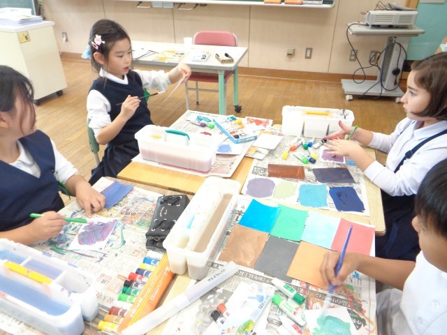 図画工作「であって生まれる いろのせかい」の学習の様子です。