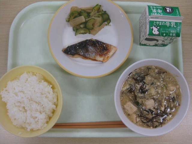 今日の献立は、ごはん 牛乳 ふくらぎの西京焼き 大根のえごまサラダ たまごともずくのスープ です。