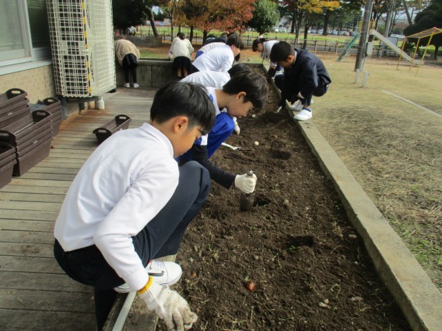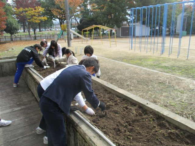 春に向けて花壇の整備をし、チューリップの球根を植えました。