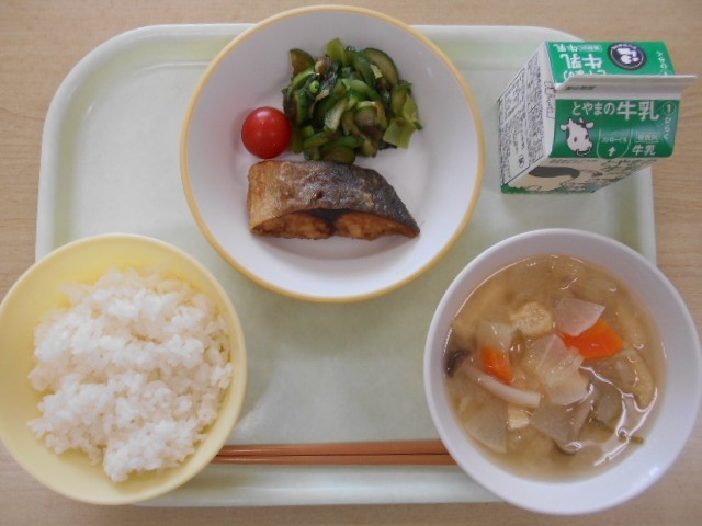 今日の献立は、ごはん 牛乳 ふくらぎのかば焼き とろろ昆布和え ミニトマト とやまの野菜たっぷりみそ汁 です。
