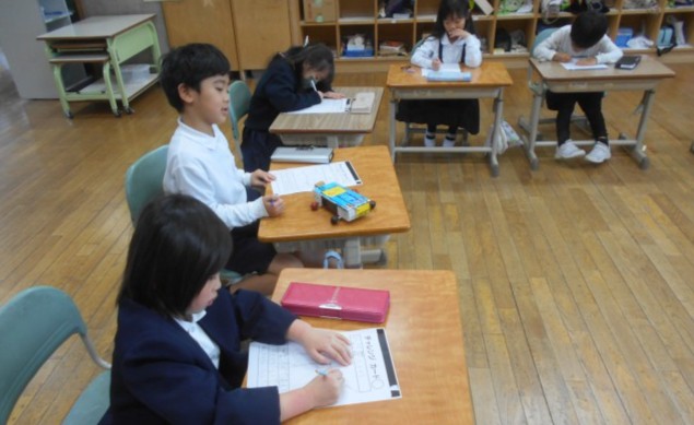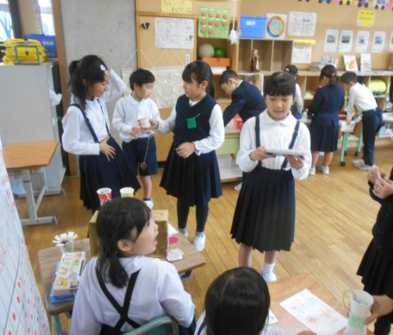 1年生の子供たちは、秋のものを使ってお店を開き、2年生を招待しました。けん玉や迷路、車や人形遊び等で、2年生を楽しませました。最後の振り返りでは、「秋を楽しむことができた」「次は冬を楽しみたい」「お客さんに楽しんでもらえてよかった」と話していました。