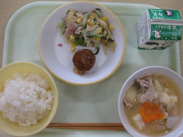 今日の献立は、ごはん 牛乳 鶏つくね 野菜炒め 豚汁 です。