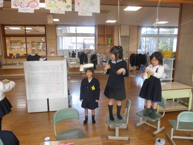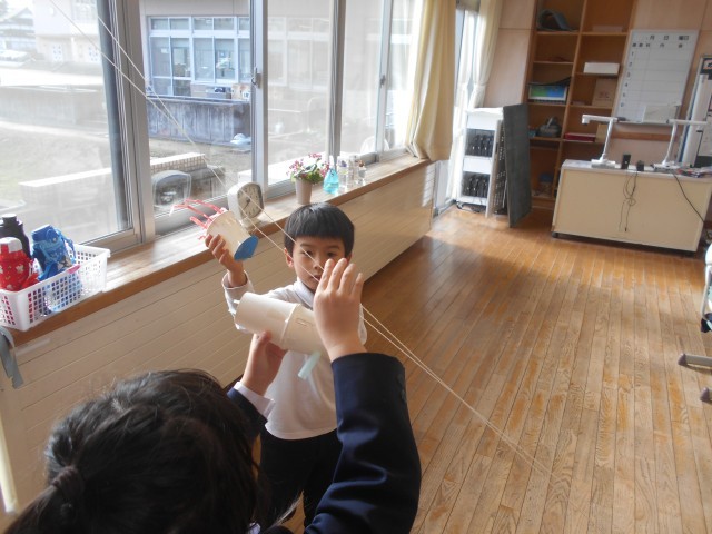 図画工作科では、クリップと紙コップや空き箱を組み合わせて、糸を伝って移動するおもちゃを作りました。子供たちは動物や乗り物等を作り、楽しそうに動かしていました。