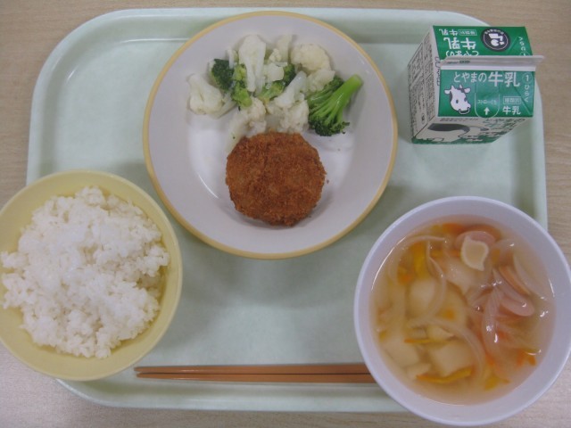 今日の献立は、ごはん 牛乳 メンチカツ 花野菜サラダ ポテトスープ です。