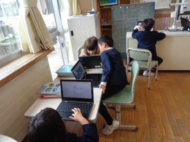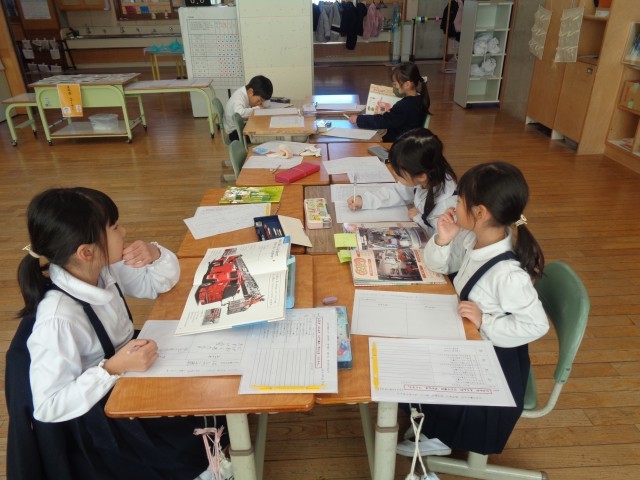 じどう車くらべの学習を生かして、今度は自分たちで自動車図鑑をつくっています。本や動画を見て、自動車について調べ、文章を考えました。