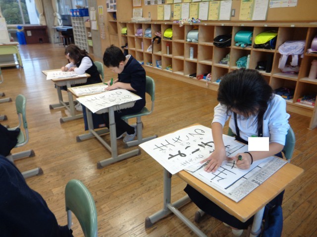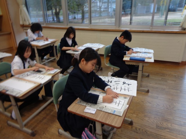 手本を見ながら硬筆墨で「生きる」と丁寧に書いています。