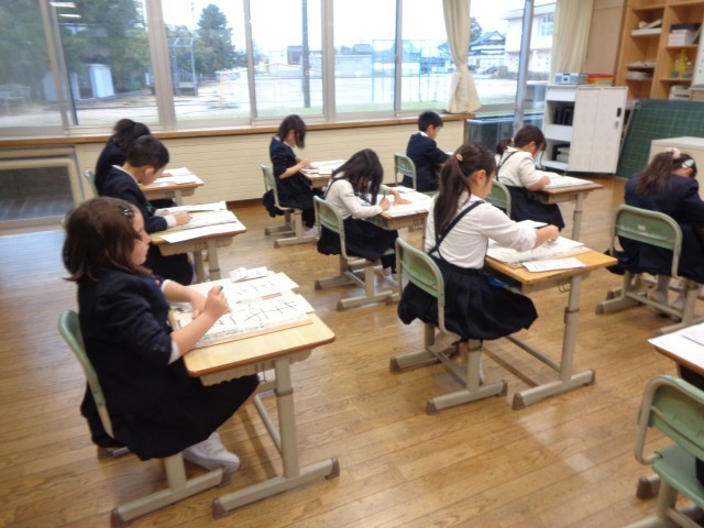 写真は書初め大会の様子です。みんな集中して書いていました。