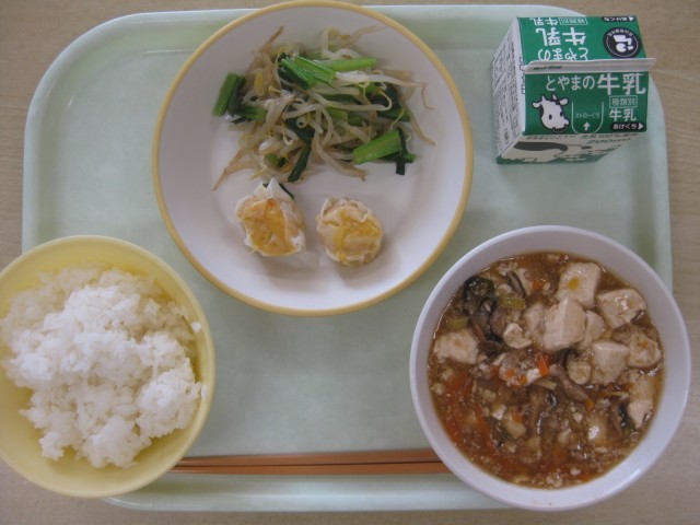 今日の献立は、ごはん 牛乳 にんじんシューマイ 塩ナムル マーボー豆腐 です。